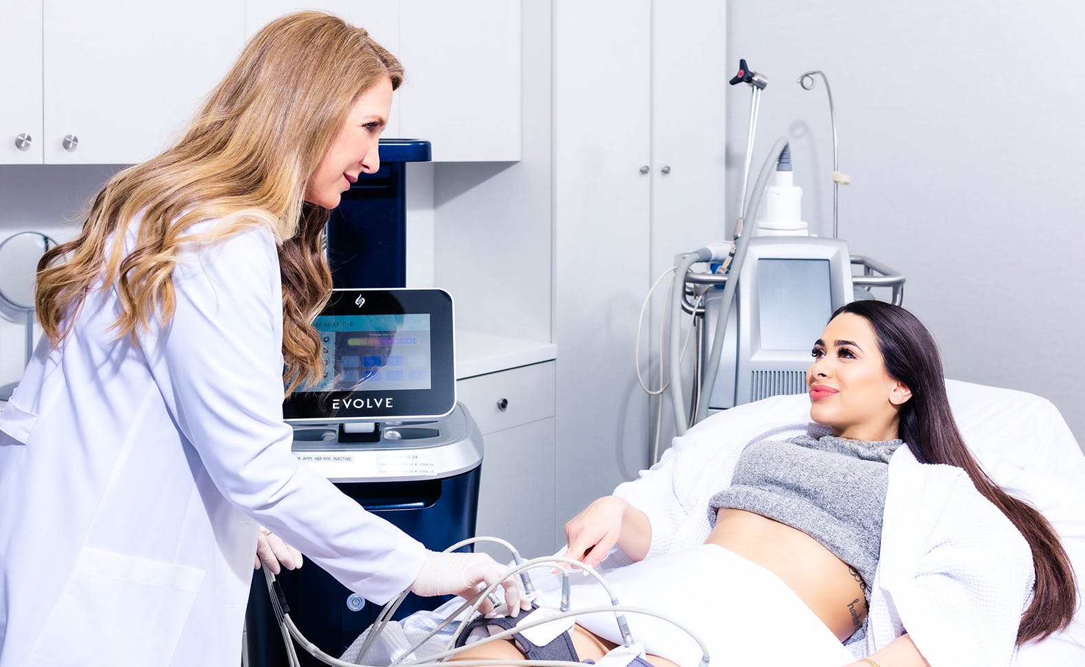 EVOLVE is a non-invasive, hands-free technology that combines body contouring, skin tightening, and muscle building into one single device. EVOLVE has three modalities — Trim, Tone, and Tite — that reduce fat; tighten and improve the skin, and builds muscle strength.